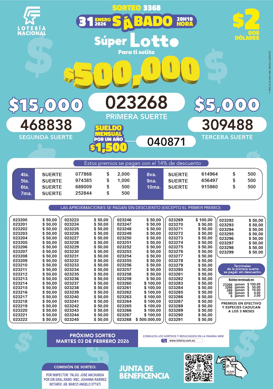 Este sábado 31 de enero de 2026, a las 20h10, se realizó el Sorteo N.º 3368 de Súper Lotto, uno de los juegos más atractivos del portafolio de Lotería Nacional, que volvió a entregar importantes premios en efectivo y un atractivo sueldo mensual.