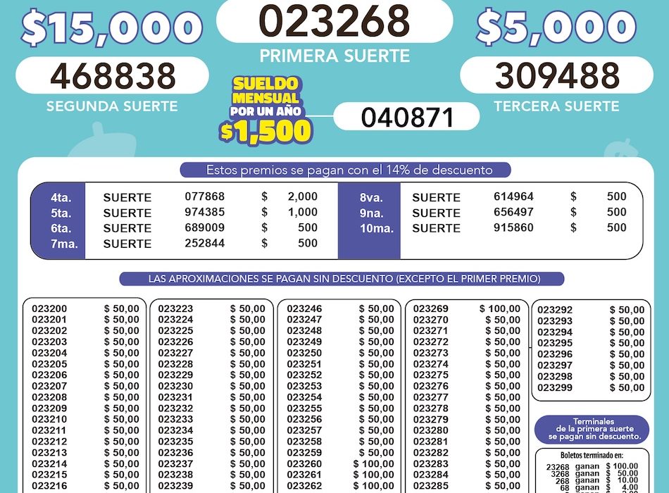 Además, el sorteo contempla cuarta a décima suerte, así como terminaciones y aproximaciones, que se pagan de acuerdo con la normativa vigente de Lotería Nacional.