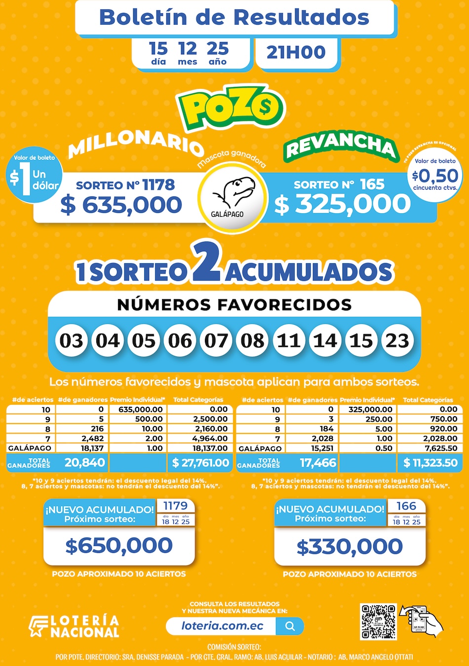 Resultados del Pozo Millonario Sorteos 1178 y Pozo Revancha Sorteo 165 del Lunes 15 de diciembre del 2025
