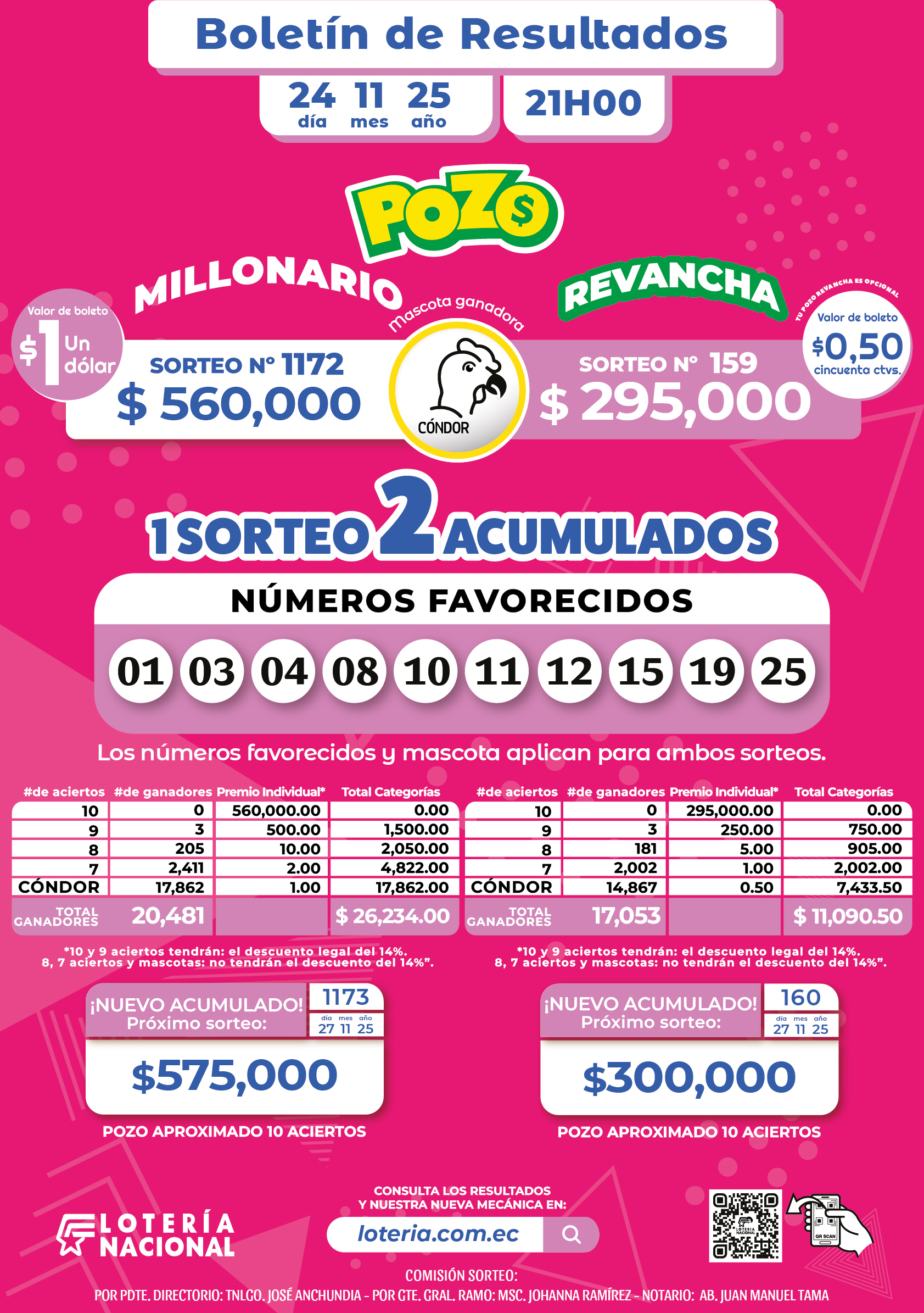 Este lunes 24 de noviembre del 2025 se llevaron a cabo los sorteos del Pozo Millonario Nº 1172 y Pozo Revancha Nº 159, dos de los juegos más esperados por miles de participantes que buscan acertar todos los números y llevarse los grandes acumulados.