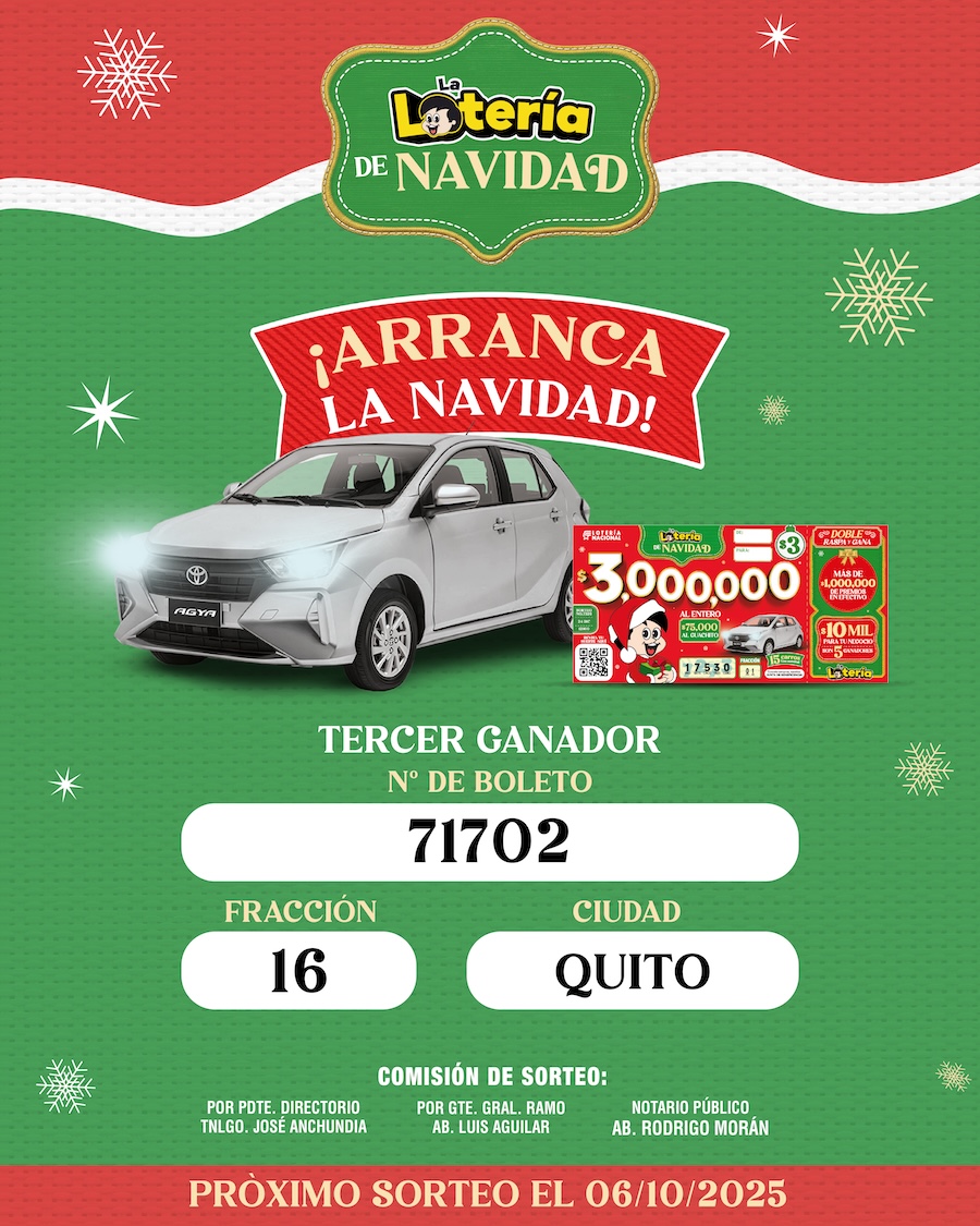 Lotería Nacional entregó el tercer auto cero kilómetros de la temporada navideña, como parte de la campaña especial previa al sorteo de Navidad. Cada semana, un nuevo ecuatoriano resulta favorecido con un vehículo completamente nuevo.